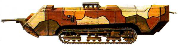 ![]() St-Chamond WWI Tank on the move looking for trouble. It is interesting to note that the original designs included a third single wide track at the front, which should have considerably improved the climbing ability of the machine, although it would also have added to its nose-heaviness. Probably for the latter reason and also, to simplify production, this feature was not included in the tanks built. |