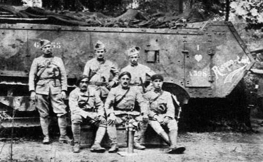 ![]() Look at the camo netting across the top of this St-Chamond tank. And judging by his body language, the chap on the left hasn't been getting along very well with his pals. |