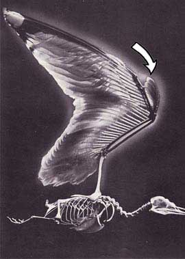 ![]() Just as in an airplane, lift is increased as the wing is tilted upward into the airstream and as long as air flows smoothly, the wing flies 'A'. But if it is tilted up too much, turbulence sets in above the wing and lift is destroyed 'B'. But, on the leading edge of most bird's wings the alula pops up to smooth out the turbulent airflow so lift is maintained. The alula is under muscular control always ready when needed. |