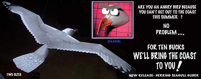 Offered in black and white (like the gull really is :), and in two sizes. There's also a goofy gull version that will smile away your recession blues. Its part of the Fiddlers Green Glider and Sailplane and Weird Aircraft Collection. There's a very unique Sea Gull Flying Boat model. Look for it in the Aircraft or Weird Aircraft Collection.