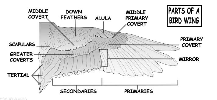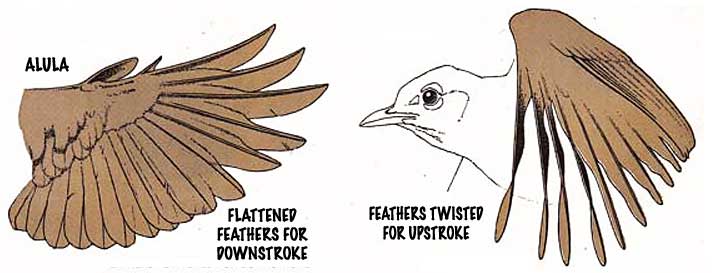 | The down stroke is the power stroke, and it's effective because the primary feather hold firm overlapping each other to present a 'closed' surface to the air..(left). On the upstroke, however, they open to allow air to slip through making it easier to lift the wing |