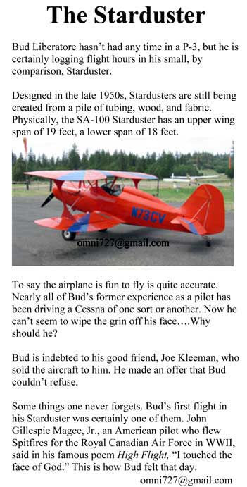This is the single place biplane designed by Lou Stolp back in 1964 that started it all. It is a very easy aircraft to fly, powered by engines in the 125 horsepower range... A fun machine! Constructed with a 4130 steel fuselage, wood spars and ribs, and covered with fabric construction, the Starduster One could only be classified as "classic."