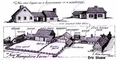 southwestern Maine and much of New Hampshire, to connecting the house and barn with a string of sheds and additions to contain the various spaces for work, storage, and domestic needs.