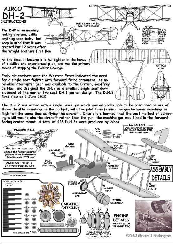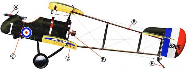 | D: Top and bottom wings carried ailerons. Once initial structural problems had been overcome and pilots had mastered its tricky handling, the DH.2 proved to be a maneuverable fighter. | E: Most DH.2s were powered by the Gnome Monosoupape rotary engine, but some later aircraft featured the 110 hp. Le Rhone engine. | F: A steerable tailskid aided ground handling, which was also improved, along with flight performance. |