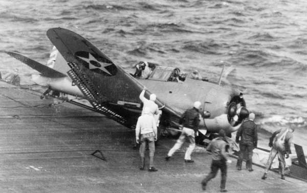 A U.S. Navy Douglas SBD-2/3 Dauntless of bombing squadron VB-6 crashes into the catwalk after catching an arrestor wire on the aircraft carrier USS Enterprise (CV-6) during operations in the Pacific, in early 1942. |