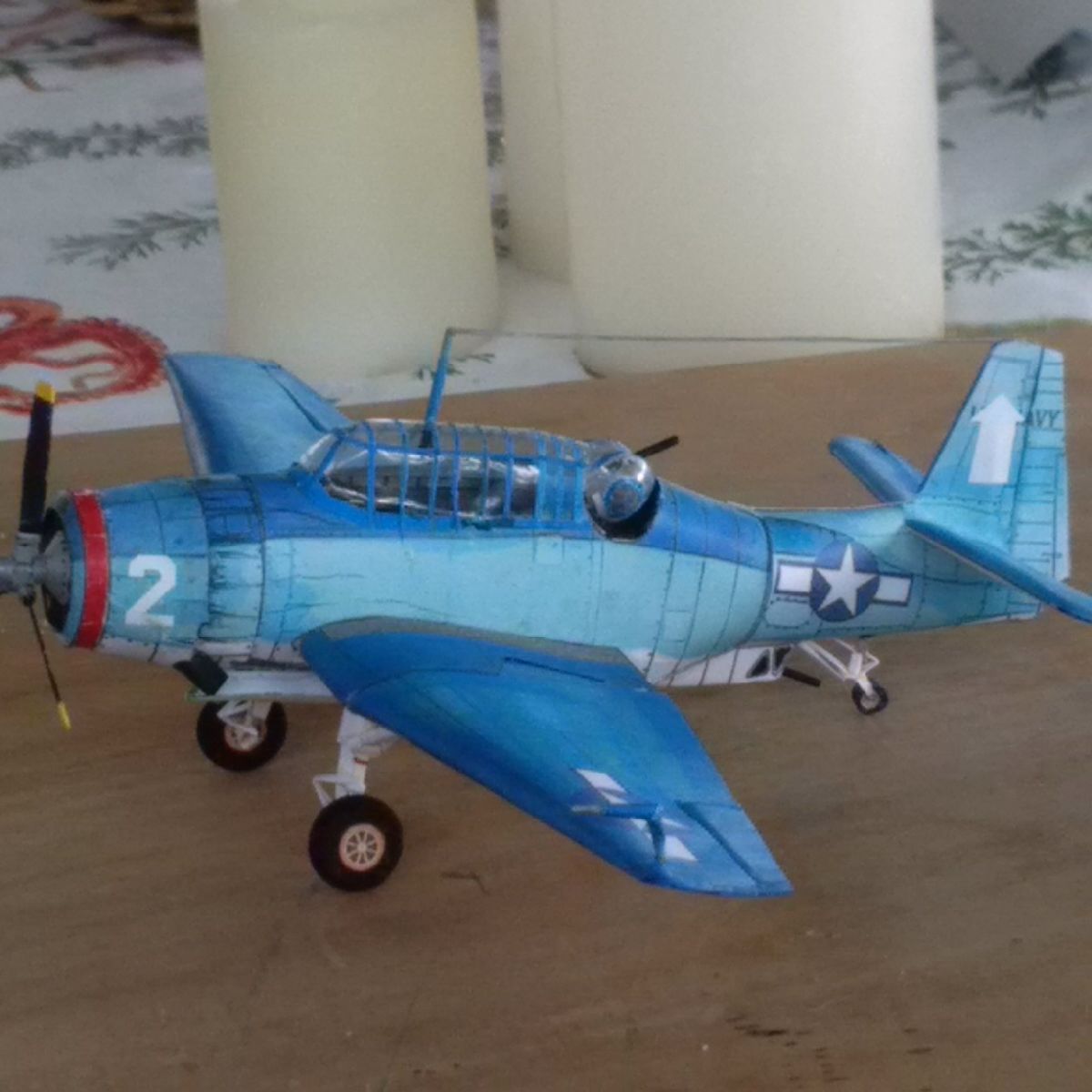Progress being made on the Grumman Avenger. Found out a secret though. If I cut off the tabs that link the fuselage together after it is "rounded," and then glue a tab underneath the area where I cut it off, then when I bring them together, I have a flush seam! Of course, all this depends upon how far you want to go....this works best if the board you've printed the model on is rather thick. Also, if I use markers of like color of the model, then the edges aren't so noticeable. One other thing, I'm going to try some "o" rings from the hardware store for the wheels..... Little propellers I can carve out of coffee stirrer sticks as well...this is for the WWI jobs and private jobs of course........ Hey, this is terrific stuff, Jim Duckworth.