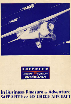 Lockheed did a pretty good graphical job of marketing their products as seen here with these 1920s-1930s posters. Lockheed had rolled out just three airplanes in 1927. Production the next year was sixty-four planes and sales were over $750,000. "It takes a Lockheed to beat a Lockheed" was the upcoming company's slogan; "Lockheed aircraft will carry the same payload farther, faster, and with less fuel expenditure," which about summed it up. The airlines became major customers for the planes and almost every speed king of the day flew Lockheed. |