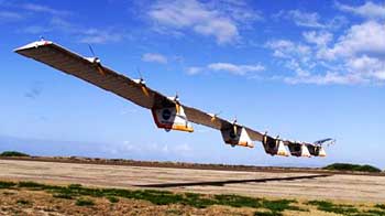 The Helios Prototype is an enlarged version of the Centurion flying wing that flew a series of test flights at Dryden in late 1998. The craft has a wingspan of 247 feet, 41 feet greater than the Centurion, 2 1/2 times that of the Pathfinder flying wing, and longer than the wingspans of either the Boeing 747 jetliner or Lockheed C-5 transport aircraft.
