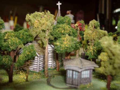 ![]() These are views of the Village Church and where it lives in the Fiddlersgreen New England Village layout. Photos of Bob Martin's personal HO scale layout. |