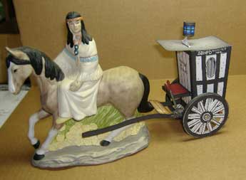 Because the is no crime what-so-ever, this is a totally un-necessary vehicle for our 100% safe Medieval Story Book Village. Hmmmm...perhaps there is no crime because of this dreaded omnipresent paddy wagon. Two sizes includes horse and driver and a set of flags you'll find interesting (Feb 2011)