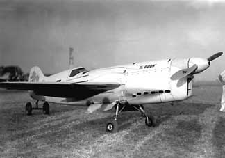 The wing was cantilever in design, constructed of spruce, covered with plywood and then in turn covered with fabric. This was also true of the tail surfaces. The landing gear was fully retractable and operated manually. The wheels retracted into the fuselage, actuating the doors which enclosed the gear, thus leaving a smooth surface on the underside of the fuselage. The wing span was 18 ft. 6 in. and the length 20 ft. 6 in. The same familiar cream color as was used on the "Jeep" was used on the "Goon" and the race number 5 was added for the Nationals.