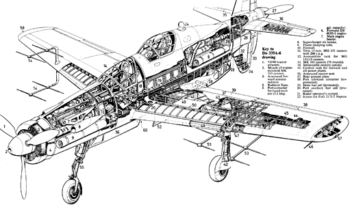 Cannon armament remained unchanged, but an FuG 101a radio altimeter was introduced together with FuG 217J Neptune intercept radar with wing-mounted antennae. Exhaust flame damping tubes for the fore and aft engines added their measure of drag to that provided by the second cockpit and the radar antennae, and normal loaded weight was increased by 1,058 lb. Performance accordingly fell by 10 per cent, but whereas the Do 335 VIO had DB 603A-2 engines, the production Do 335A-6 was intended to have DB 603E engines with provision for methanol-water injection (MW 50) for power boosting below the rated altitude of the power plants. Provision was to be made in the wings for two 33 Imp. gal. MW 50 tanks, power being boosted to 2,400 h.p. at sea level per engine.