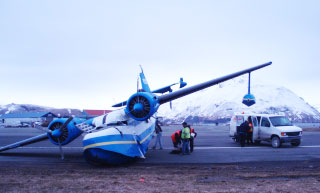 Nine people received minor injuries when a PenAir Grumman Goose collided with a truck during landing. |